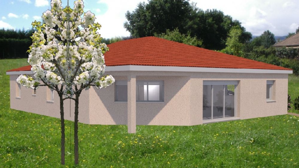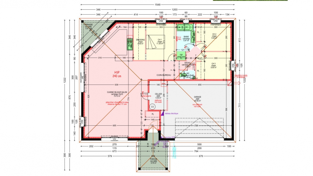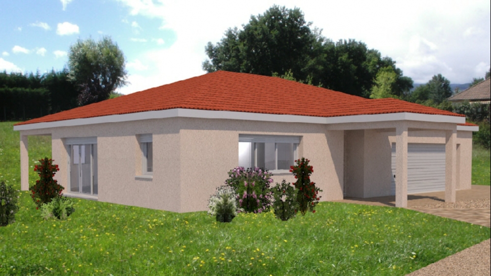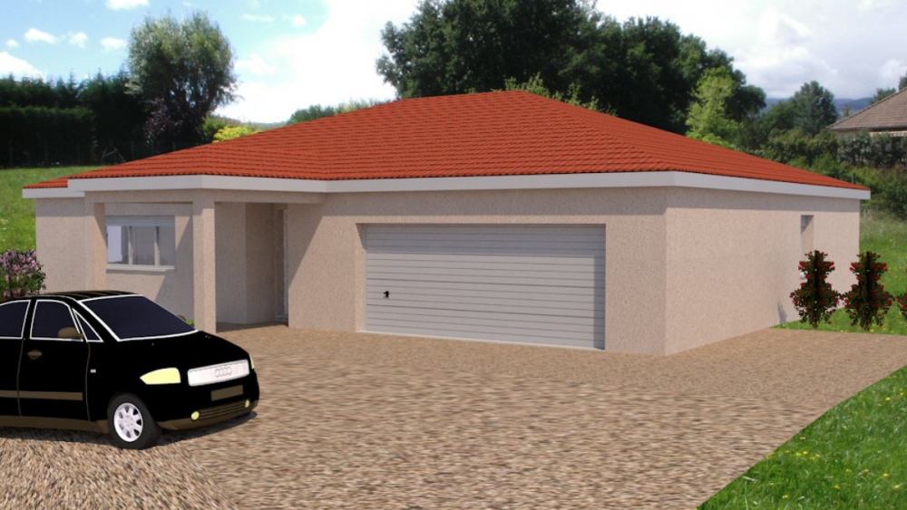 Maison de plain pied avec 3 chambres et un dressing, une cuisine ouverte sur un grand séjour, un cellier, un garage, un porche et une terrasse.