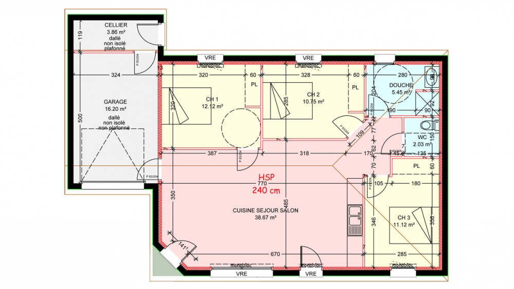 Maison de plain pied avec 3 chambres, un grand séjour, un cellier, un garage et un porche.