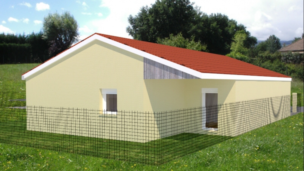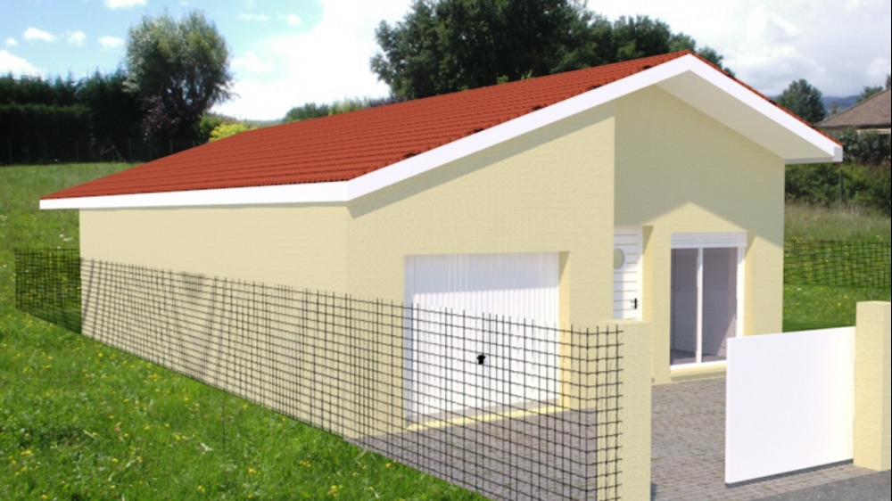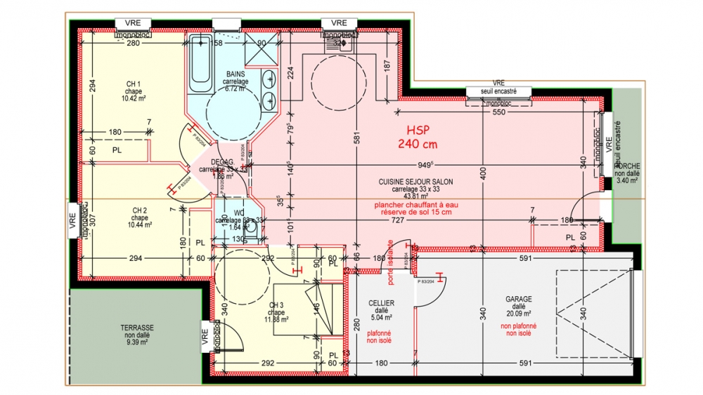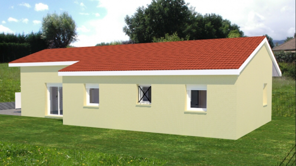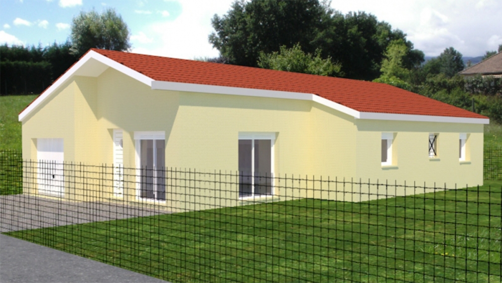 Maison de plain pied avec 3 chambres, un grand séjour avec plancher chauffant et cuisine ouverte, un cellier, une terrasse et un garage.